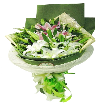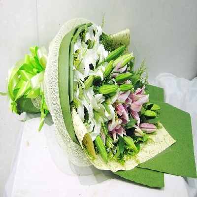 【材 料】:精选多头白色香水百合6枝,多头粉色香水百合5枝,合计33朵。黄莺丰满。